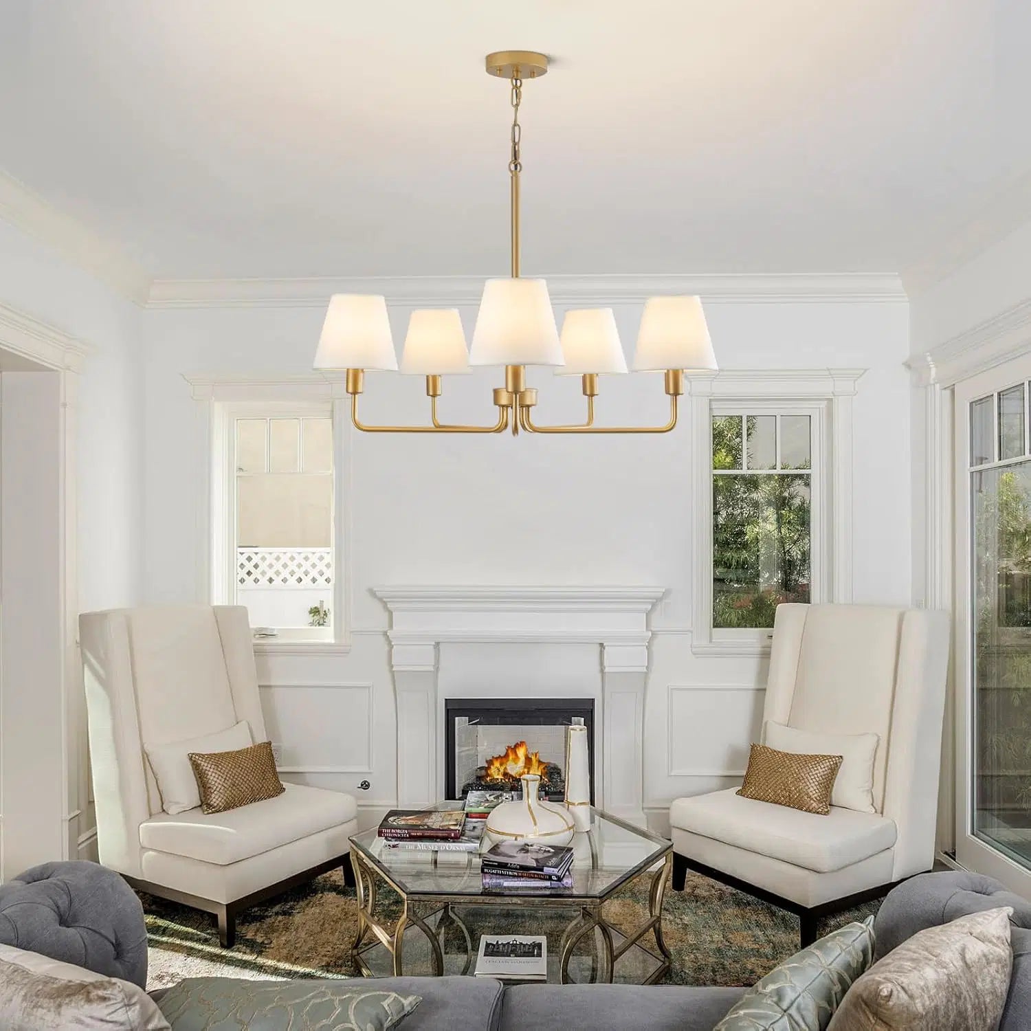Featuring five soft white fabric lampshades, this chandelier diffuses a gentle, eye-comforting glow — perfect for dining rooms, bedrooms, or entryways. The high-quality fabric shades ensure an evenly spread light, enhancing ambiance while protecting your eyes.