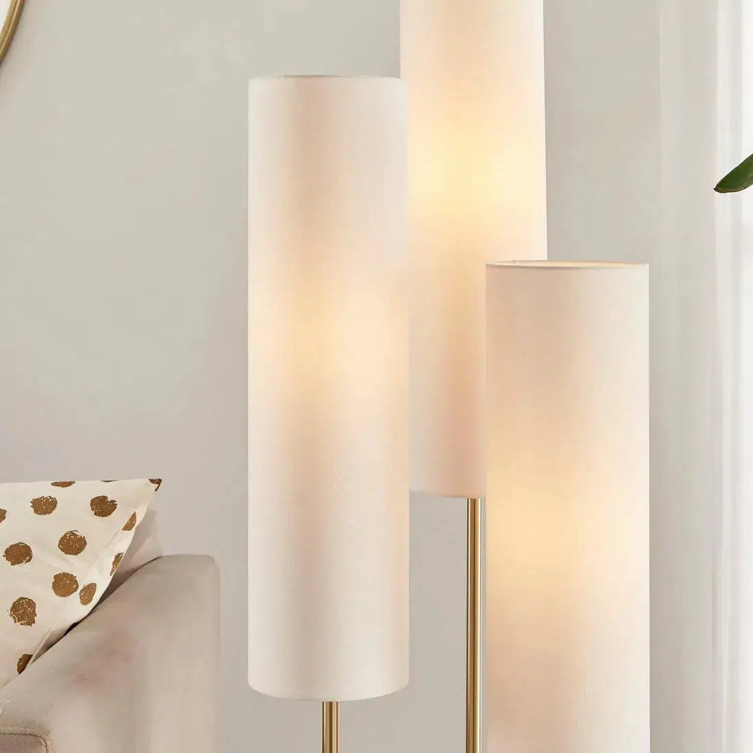 Our Suri Triple Floor Lamp has three white fabric lamp shades and brass gold-toned accents to create a beautifully tiered cluster effect. It adds soft statement lighting to your living room, bedroom, or any space that needs a touch of glam glow.